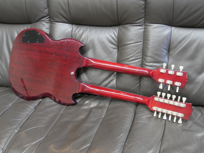 | ARIA PRO-II SG Double Neck Well, the guitar Hero, Jimmy Page Model SG Double Neck. Not Gibson made guitar. This is absolutely JV guitar, Aria Pro II brand, probably Matsumoku made guitar. I do not know Gibson original EDS. So, it is difficult to evaluate this Aria is good or not as replica. The reason I got this guitar is I want to get 12 strings electric guitar. I have been looking for Rick 12 strings type. Unfortunately, it is getting tough to get the good condition JV 12 strings. Price of those JV is higher and higher after COVID pandemic. Anyhow, I got this guitar. This guitar is giving me a good impression. The 12 strings sound is pretty good, I satisfied. The looks good too. It is Jimmy page looks guitar. Again, I don't know Gibson original, therefore no idea, how this guitar's construction is closed to Gibson. Like body wood, neck wood...no idea. But for me, it is enough quality. I have changed the pickup to Gotoh Classic Alpha type Humbucker. The original PU have the cream bobbins. It can not be look like Jimmy's. So, I changed it and switch knobs. So far, that's all, I did. I do not intend to sell this guitar now. Love it pretty much. Just see the pictures for your reference. |