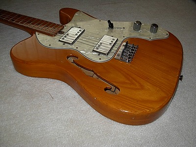 | Ganson TL-Thinline Type Ganson is also produced by Kasuga same with Gaban. Ganson brand is stated a bit earlier tahn Gaban. We could see the Les Paul and Strat model sometimes, but Telecaster Thinline type is really rare item. The condition of this guitar is good. Of course, it is over 30 years old guitar. There are many dent sand scratches. However, these are not really serious damages. The neck is 2P (head Area is 2P) + Maple finger board. The neck, frets and electric circuits are fine. The pick up size are Gibson size not Fender Humbuckers. It is easy to change the PUs for other gibson size PU. The nut is not like Fender style. It is almost like Gibson style nut. Well, it is not really good Replica, but pretty good deep tone. This is very rare guitar even not really good replica. If you are looking for the good, rare JV guitar, this is one of them. |