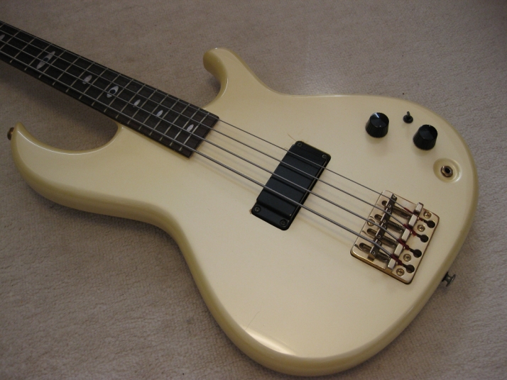| Aria Pro-II Matsumoku Made SB-R60 This bass is 1983 Matsumoku made SB-R60. It is generally good condition. The neck, frets and electric circuits are all proper condition. The brass nut width is 41.55 mm. The neck shape is like Precision bass. The bridge is a bit rusted, but good weight brass made. There are almost no dents. However, when I changed the PU, I made a bit cracks around PU. The cavity was so small (too tight). Maybe, when they paint, they put the original PU soon. So the cavity became smaller than PU bottom size. Weight is 4.69 as a bit light weight of Aria SB average. As I said, the oroginal PU was broken. I have discussed with Aria Tech people and have decided to change the PU to brand new Aria SB pick up. So, this PU is current SB brand new. It is very good tone. We are going to ship this bass with used Soft Carrying case. Well, enjoy JV bass ! |