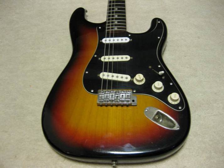 | FERNANDES Revival Stratcaster 76 Model This guitar was made in maybe 83 time. Fernades started their revival series in 1981. They made the vintage model first, then, added 70's style Strat. This guitar is probably original condition except PU cover and knobs?. I have checked body inside. The PUs are probably original, Gray bobbin type. The neck is straight no twisting. Maple 1P with RFB with approx. 41mm nut. The body weight is 3.56Kg. I think the body weight is lighter than original Fender USA! The body condition is good. It is good looking. The sound, yes, good start sound... Revival 76 model is a bit tough to find, compare with 57/62 model. Hope, you like this guitar and just play "Hard Rock"! Try good time JV guitar ! |